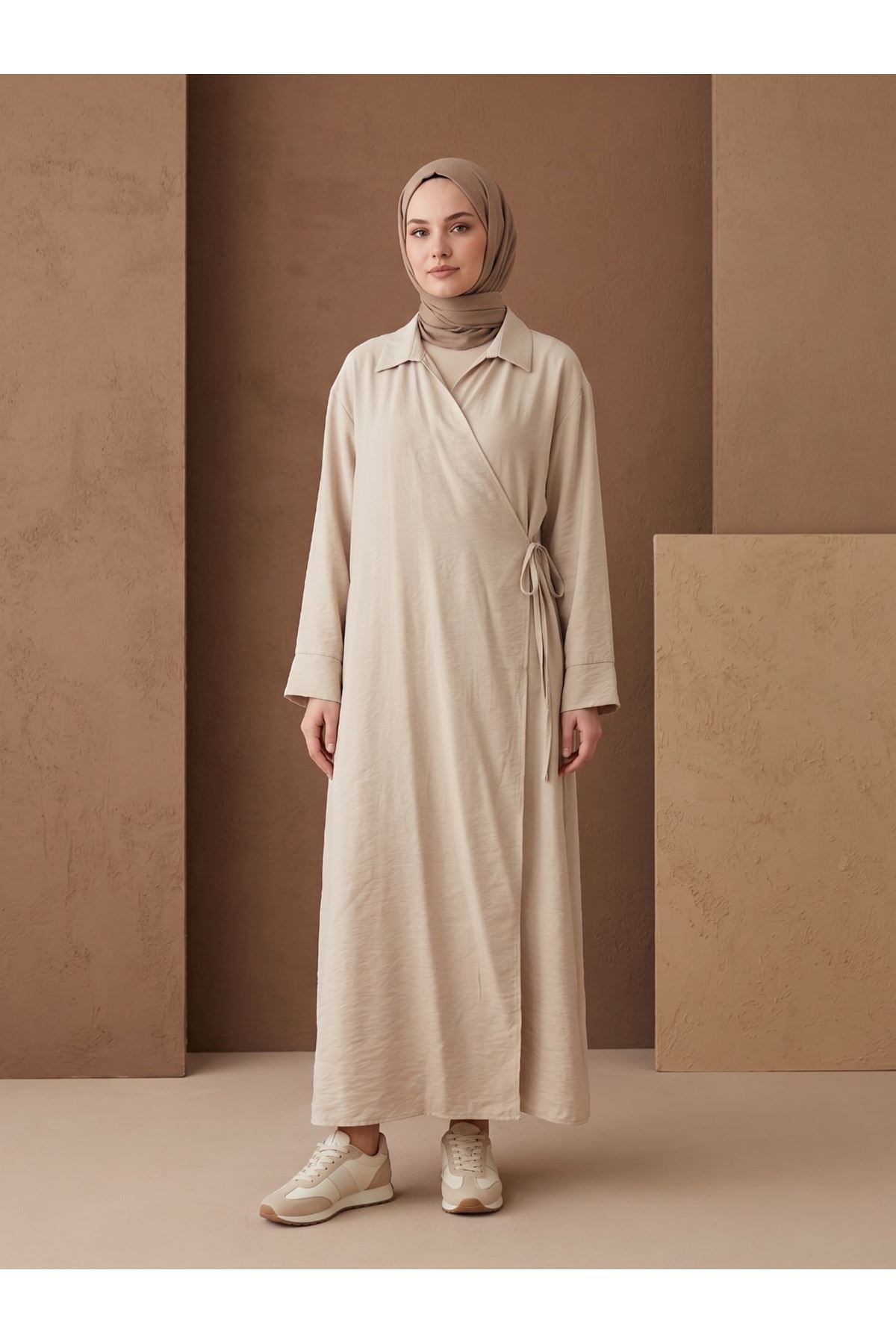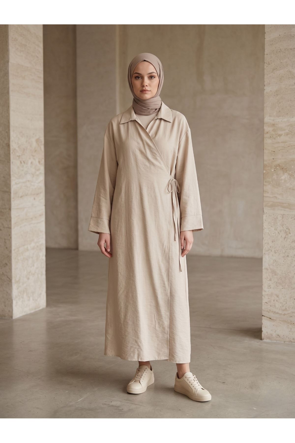 Yakalı Yandan Bağlamalı Uzun Ceket