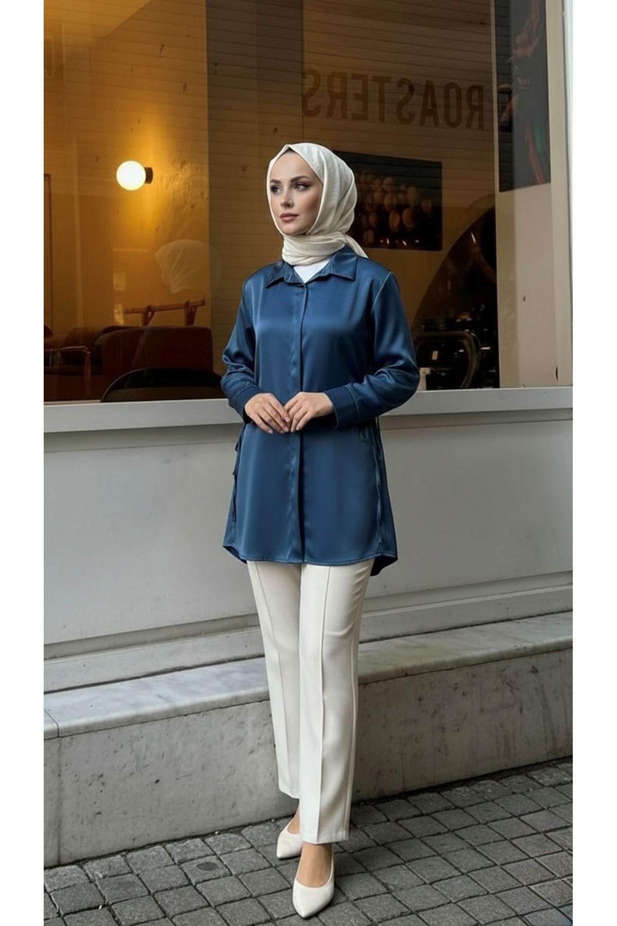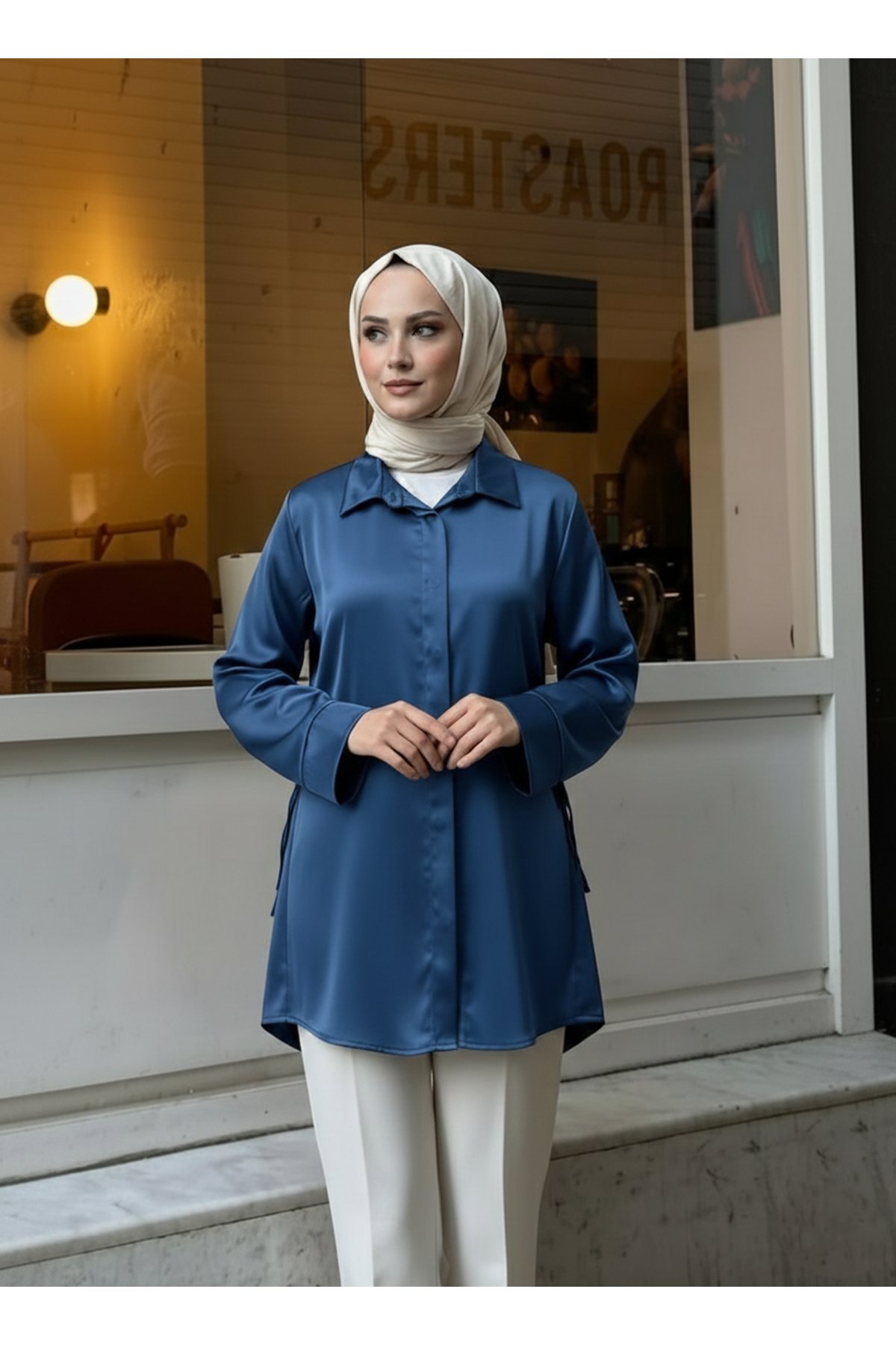 Yan Bağlamalı Saten Tunik-Petrol Mavisi