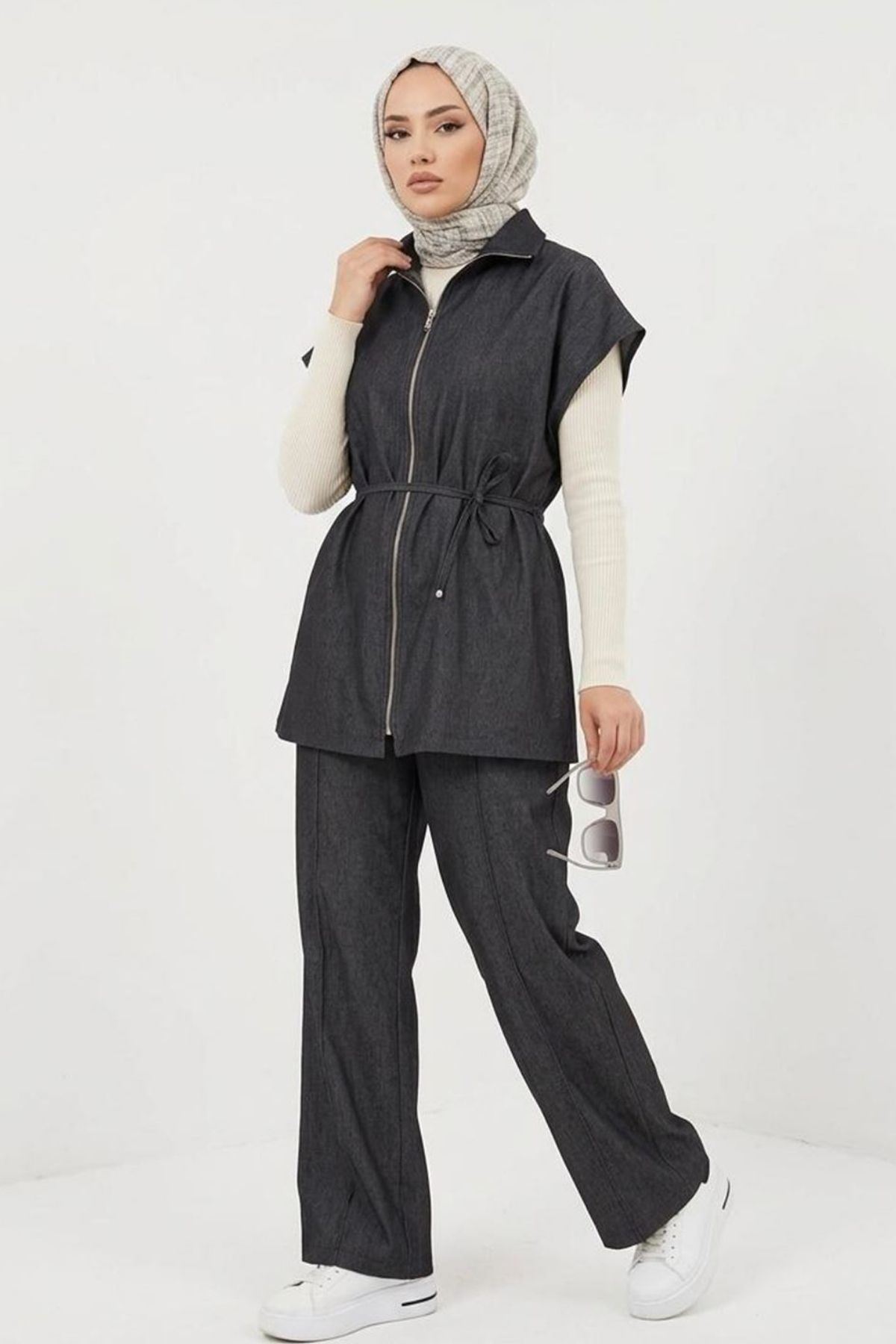 Modern ve rahat tasarımıyla öne çıkan siyah fermuarlı yelek pantolon tesettür ikili takım, günlük kombinlerde ve şehir stilinde şıklığı ön plana çıkarır. Belden bağlama detaylı yelek tasarımı vücuda zarif bir görünüm kazandırırken rahat kesim pantolon gün boyu konfor sağlar.