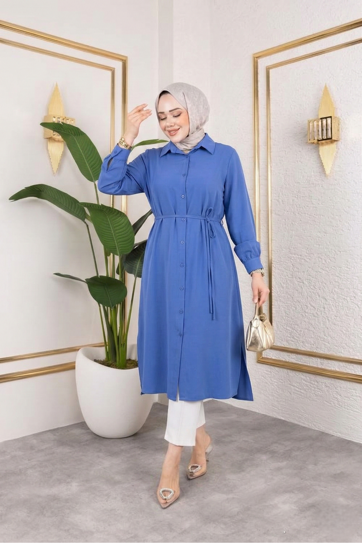 Kadın Yırtmaç Detaylı Kuşaklı Gömlek Yaka Boydan Düğmeli Uzıun Tesettür Tunik-İndigo