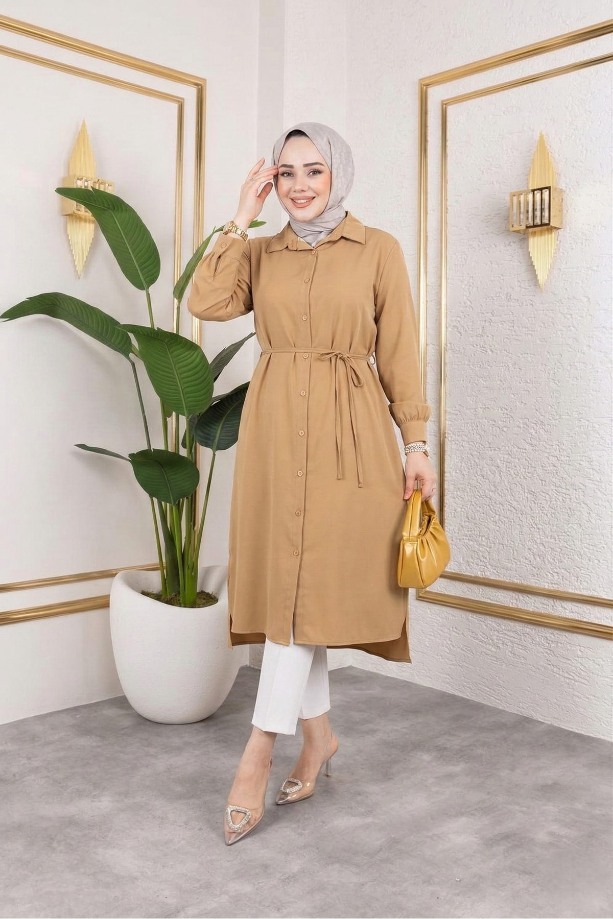 Kadın Yırtmaç Detaylı Kuşaklı Gömlek Yaka Boydan Düğmeli Uzıun Tesettür Tunik-Karamel