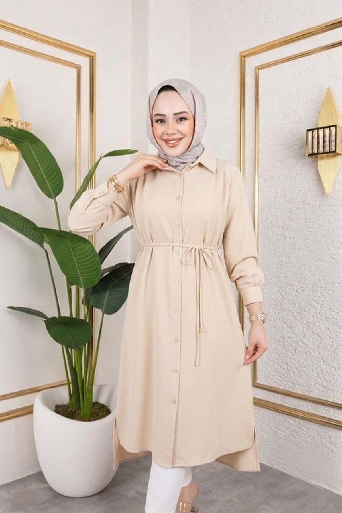 Kadın Yırtmaç Detaylı Kuşaklı Gömlek Yaka Boydan Düğmeli Uzıun Tesettür Tunik-Taş